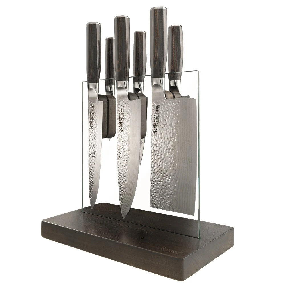 โข A comprehensive set that is equipped with 1 x 20cm Chefs Knife, 1 x 17cm Cleaver Knife, 1 x 20cm Carving Knife, 1 x 14cm Santoku Knife, 1 x 12cm Utility Knife and 1 x 9cm Paring Knife housed in a premium Acacia wood and tempered glass knife block, all backed by the Baccarat LIFETIME GUARANTEE!