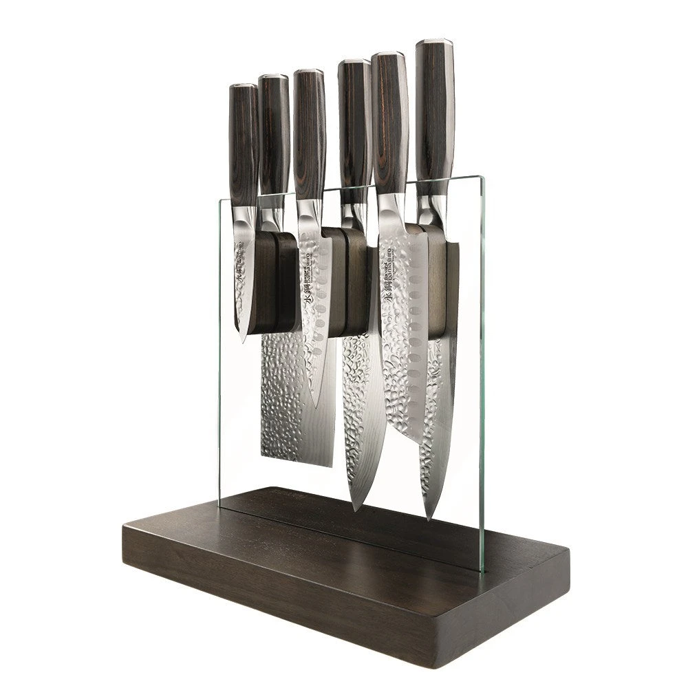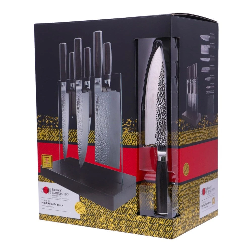 Experience superior craftsmanship and outstanding cutting quality with the Baccarat Damashiro Emperor Hikari 7 Piece Knife Block! This impressive set comprises of 6 essential kitchen blades to suit all your cooking needs. Each knife is constructed from premium quality Japanese steel that has been ice hardened to enhance the strength and durability. The blades are finished with an eye-catching tsuchime hammered look and a traditional inspired Damascus blade that is reminiscent of flowing water. Fitted with gorgeous pakka wood dark walnut handles that mould to the shape of your hand, the Damashiro Emperor knives are designed to comfort and reduces hand fatigue. Presented beautifully boxed, the Baccarat Damashiro Emperor Hikari 7 Piece Knife Block makes a stunning gift for birthdays, housewarmings, engagements and other special occasions. To keep these knives in pristine condition, keep them stored in the stylish Acacia wood and tempered glass Baccarat Emperor Hikari knife block.