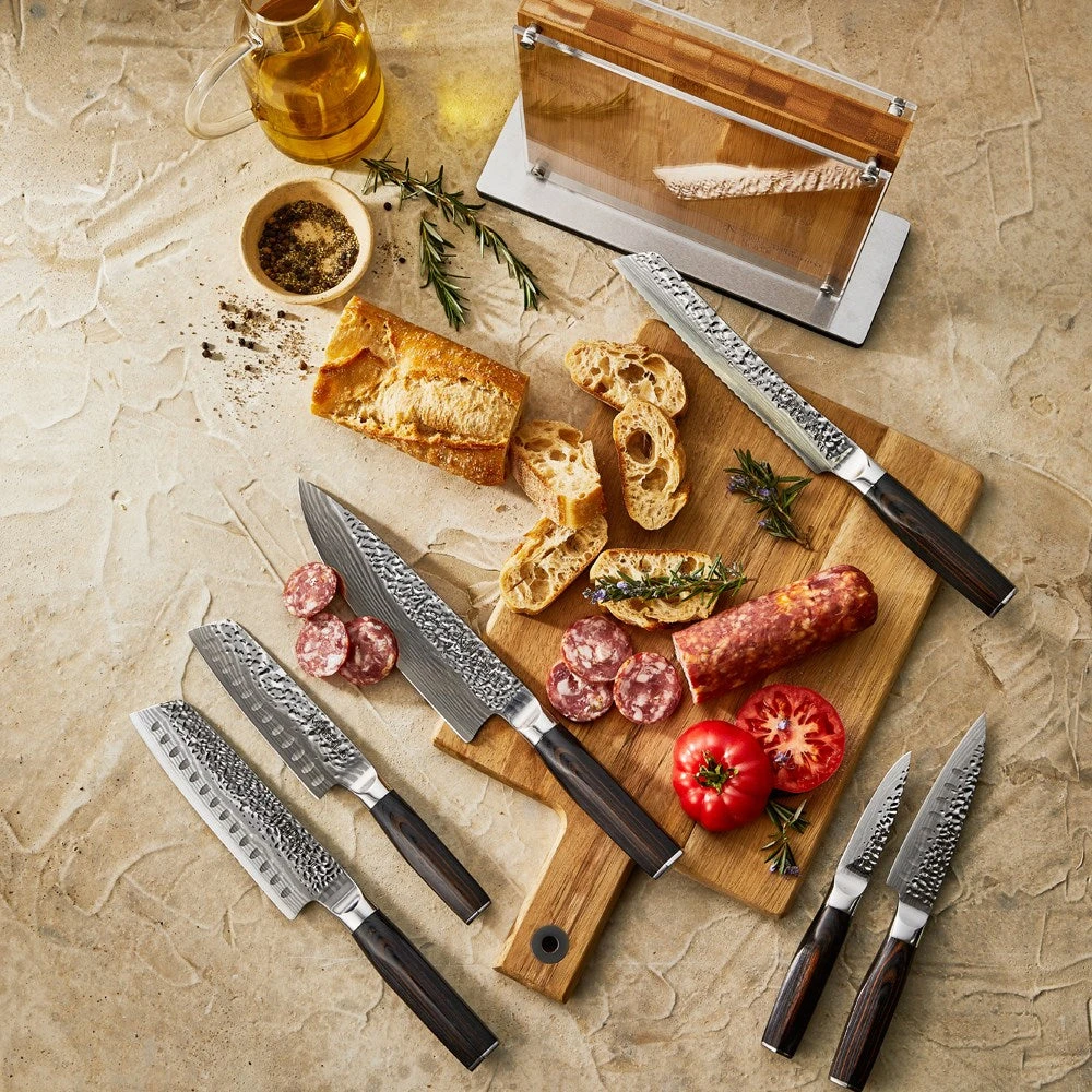 • The Baccarat® Damashiro® EMPEROR Shi Knife Block 7 Piece contains: 1 x 20cm Chef Knife, 1 x 20cm Bread Knife, 1 x 17cm Santoku Knife, 1 x 14cm Santoku Knife, 1 x 12cm Utility Knife, 1 x 9cm Paring Knife. Housed in a stylish knife block to showcase your blades.