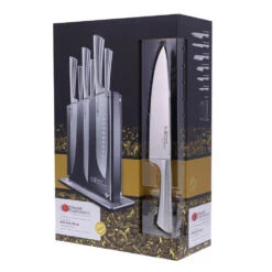 • Comprehensive set features 1 x 20cm Chefs Knife, 1 x 20cm Bread Knife, 1 x 17cm Santoku Knife, 1x 12.5cm Santoku Knife, 1 x 12cm Utility Knife and 1x 9cm Paring Knife. Housed in a beautiful knife block