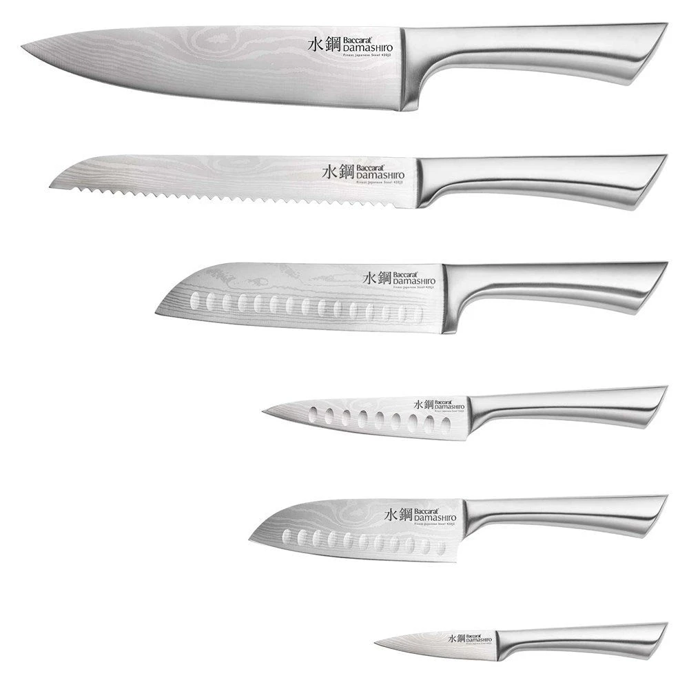 • The Baccarat® Damashiro® 7 Piece Kin Knife Block contains: 1 x 20cm/8" Chefs knife, 1 x 20cm/8" Bread knife, 1 x 17cm/6.5" Santoku knife, 1 x 12.5cm/5" Santoku knife, 1 x 12cm/4.5" Utility knife, 1 x 9cm/3.5" Paring knife