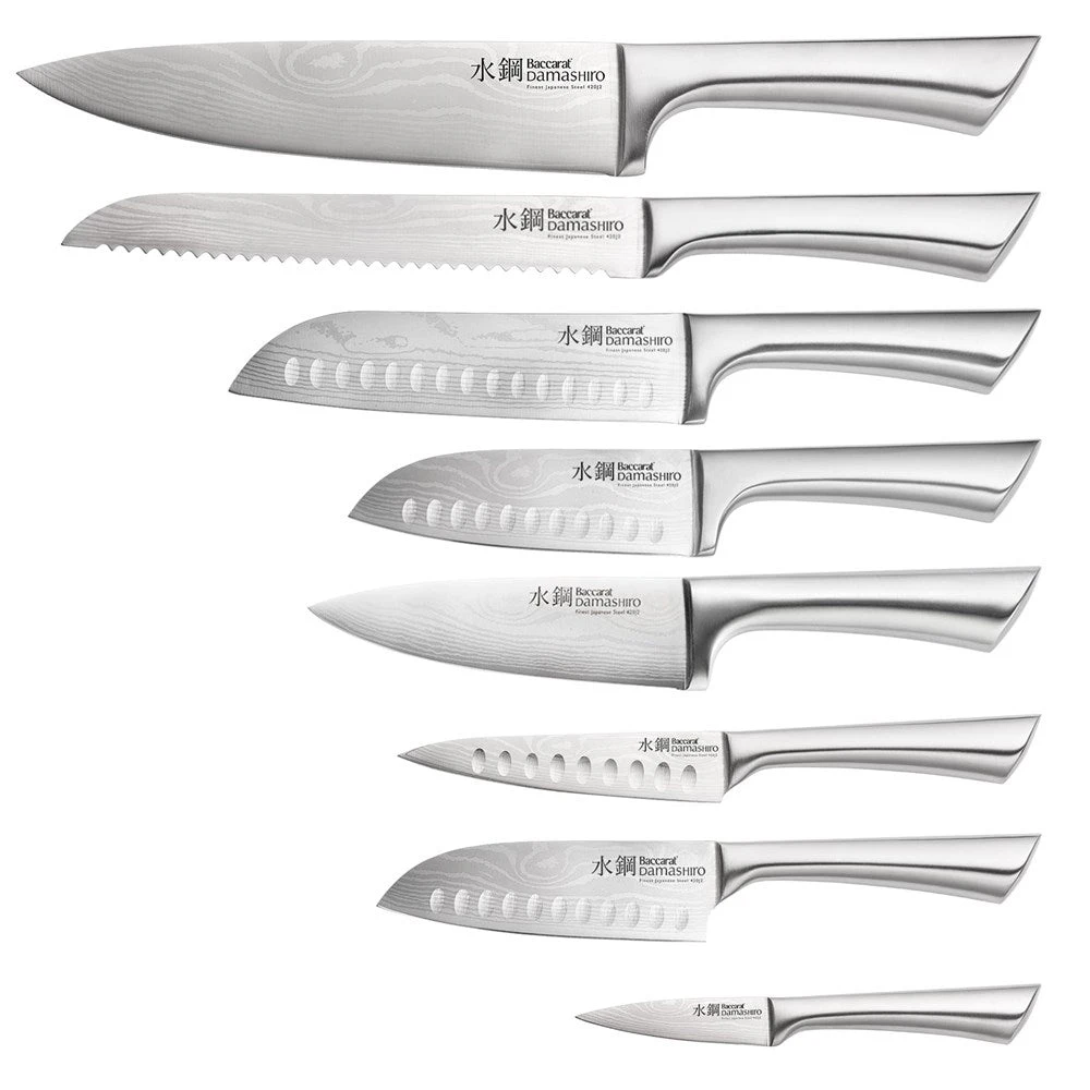 • The Baccarat® Damashiro® 9 Piece Nami Knife Block set contains: 1 x 20cm/8" Chef Knife, 1 x 20cm/8" Bread Knife, 1 x 17cm/6.5" Santoku Knife, 1 x 14cm/5.5" Santoku Knife, 1 x 15cm/6" Mini Chef Knife, 1 x 12.5cm/5" Santoku Knife, 1 x 12cm/4.5" Utility Knife, 1 x 9cm/3.5" Paring Knife