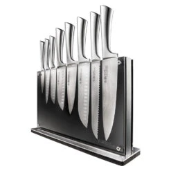 • Comprehensive set features 20cm Chefs Knife, 15cm Mini Chefs Knife, 20cm Bread Knife, 17cm Santoku Knife, 14cm Santoku Knife, 12.5cm Santoku Knife, 12cm Utiliy Knife and 9cm Paring Knife. Housed in an attractive knife block