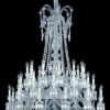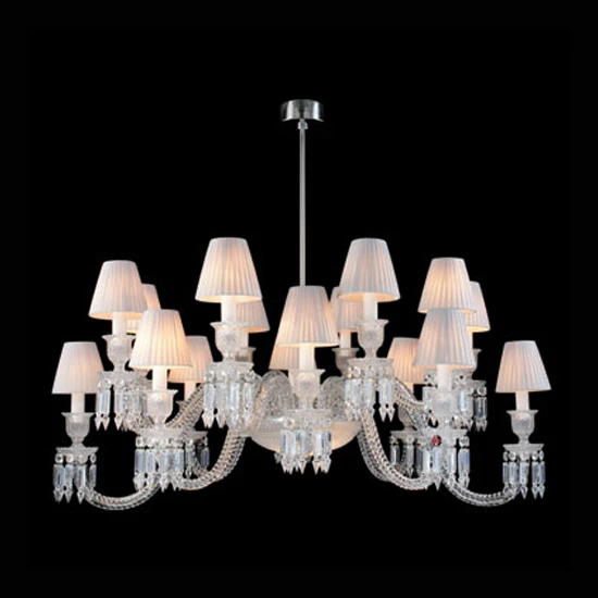 Oval chandelier in clear crystal. Its oval shape is achieved through the use of Zenith branches in varying lengths developed along the same lines. The central bowl in satin-like crystal is illuminated by LEDs. The tubing is in polished stainless steel and the canopy in nickel-plated polished brass. Two options for displaying your chandelier – with or without white taffeta lampshades (**Lampshades Sold Separately**).