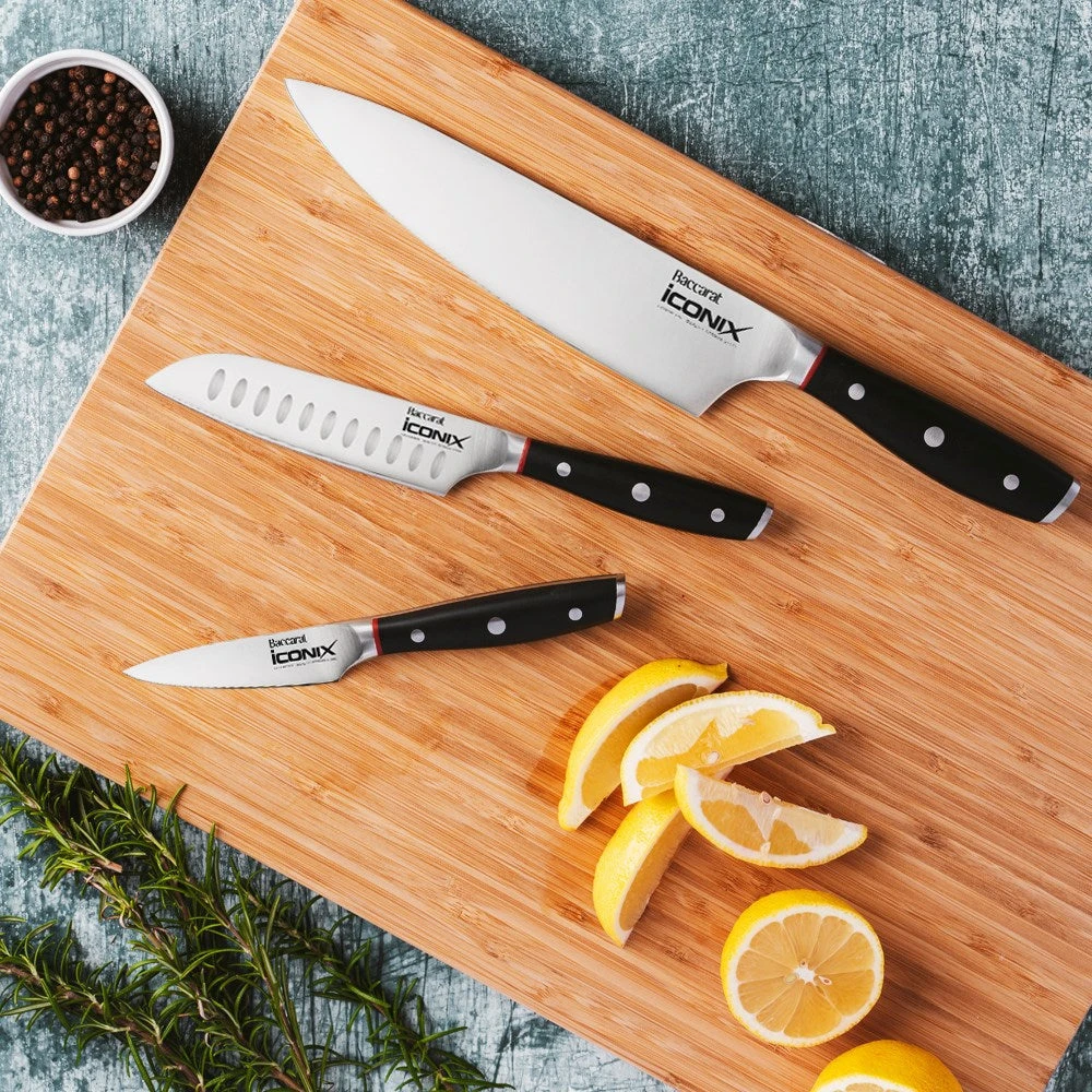 The Baccarat® iconiX® 3 Piece Starter Knife Set has the three Best Essential kitchen knives that you would need. From cutting and mincing meats, to chopping and slicing vegetables, fruits and more. The Baccarat® iconiX® Starter Set will help you prep your food with the utmost precision and comfort.