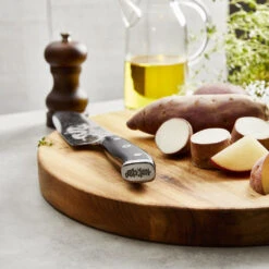 • The Baccarat® KIYOSHI Santoku is #1 in the kitchen for Cutting, Slicing, Chopping, Dicing, Mincing and so much more. It is the Perfect knife when cutting meats, slicing cheeses, and chopping or dicing vegetables and nuts. The recessed scallops situated above the blade's edge assists to release thin slices and sticky food after slicing.