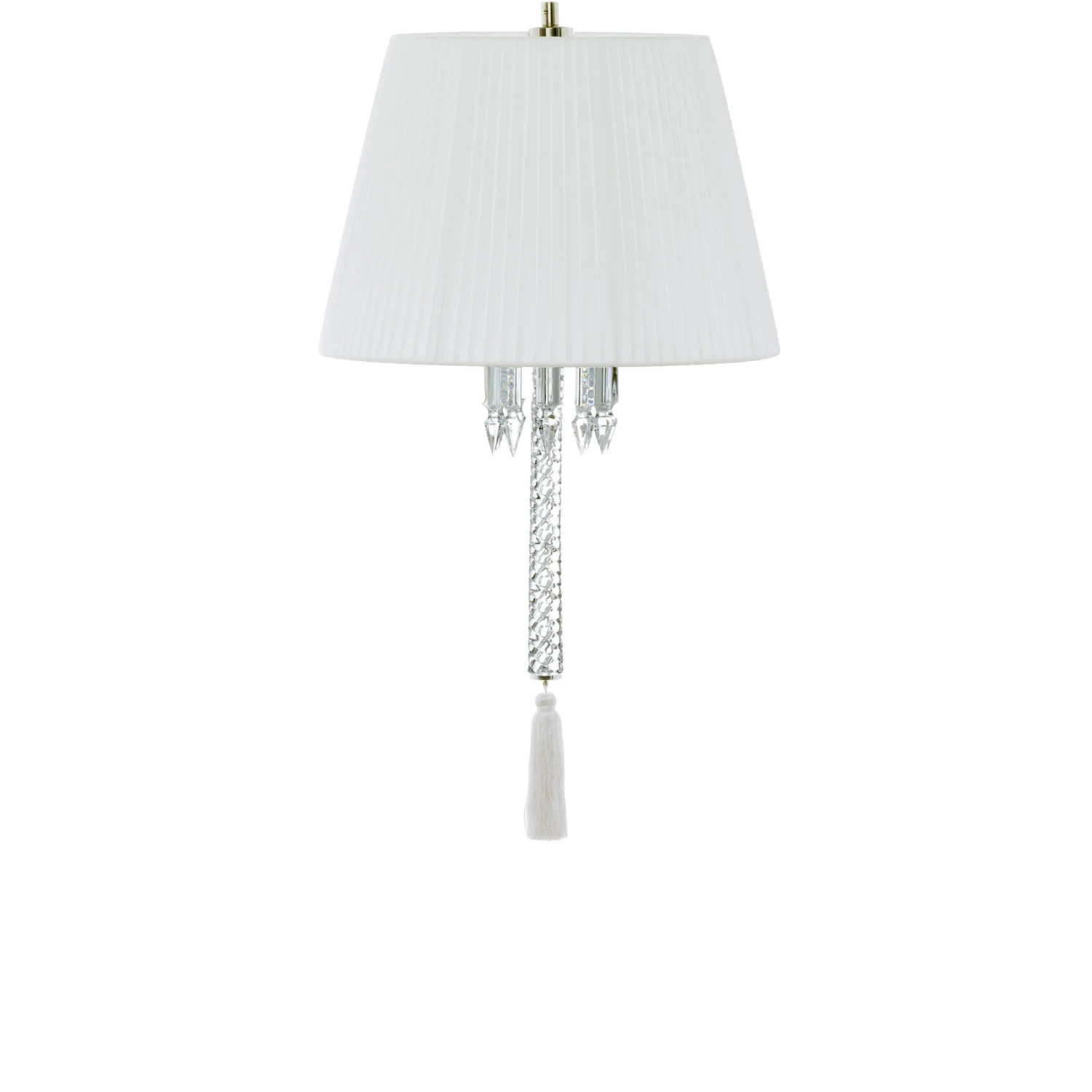 The Torch range draws inspiration from Baccarat�s exquisite Z�nith chandelier reinventing its illustrious traditional elements by juxtaposing them an unexpected way. Dripping Clear crystal pendants peek out from beneath a pleated white taffeta lampshade, glimmering discreetly yet resplendently. A tassel (in either black, white, or red) is prominently suspended below the shade, and the shiny nickel-plated brass socket features Baccarat�s elegant signature. The Torch lamp is also available with an upside-down black linen shade, which adds a dash of humor. The Fant�me ceiling lamp, also designed by Levy, echoes Torch ceiling lamp�s floaty, aerial effect.