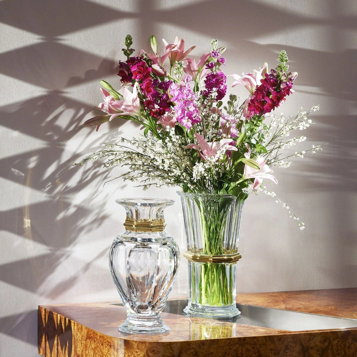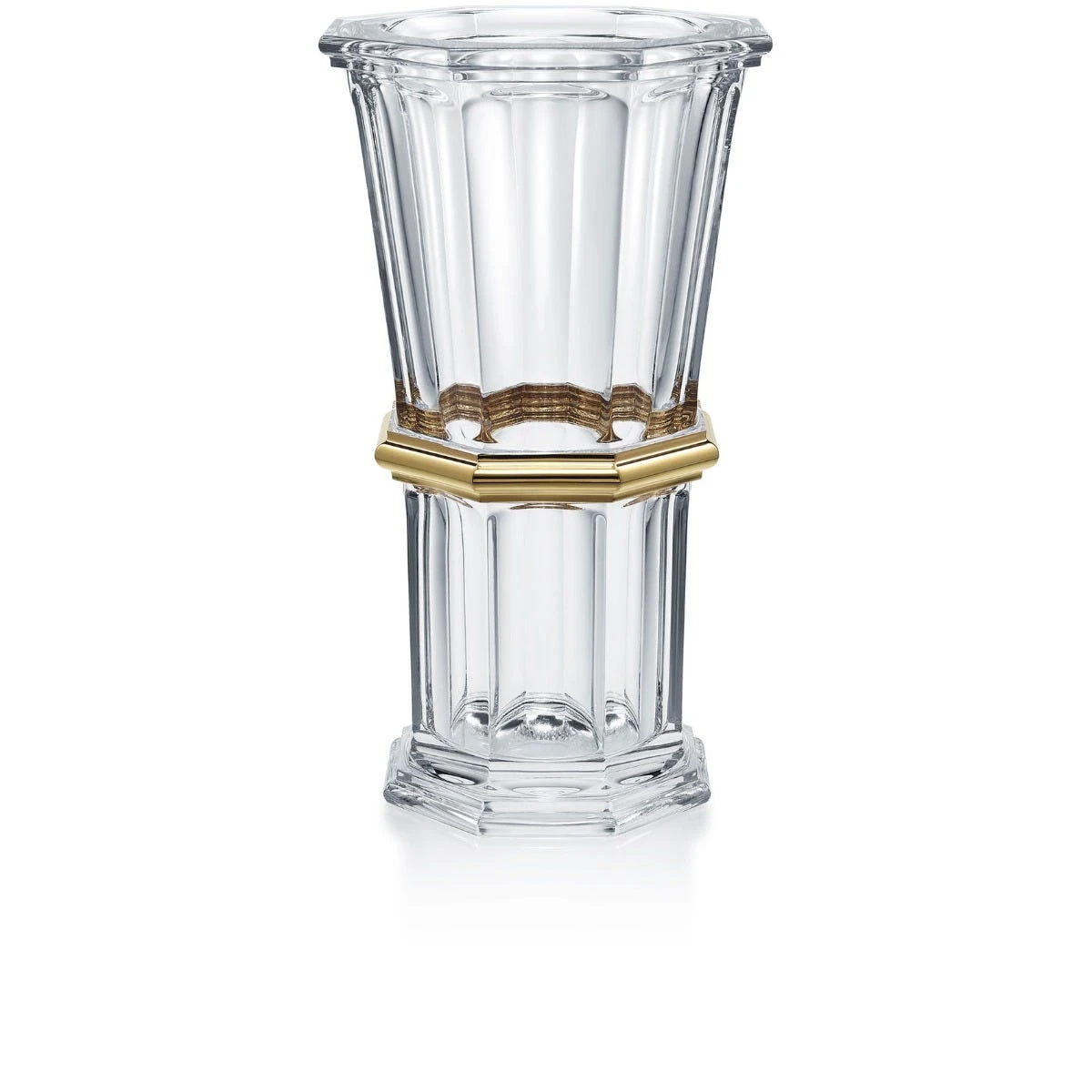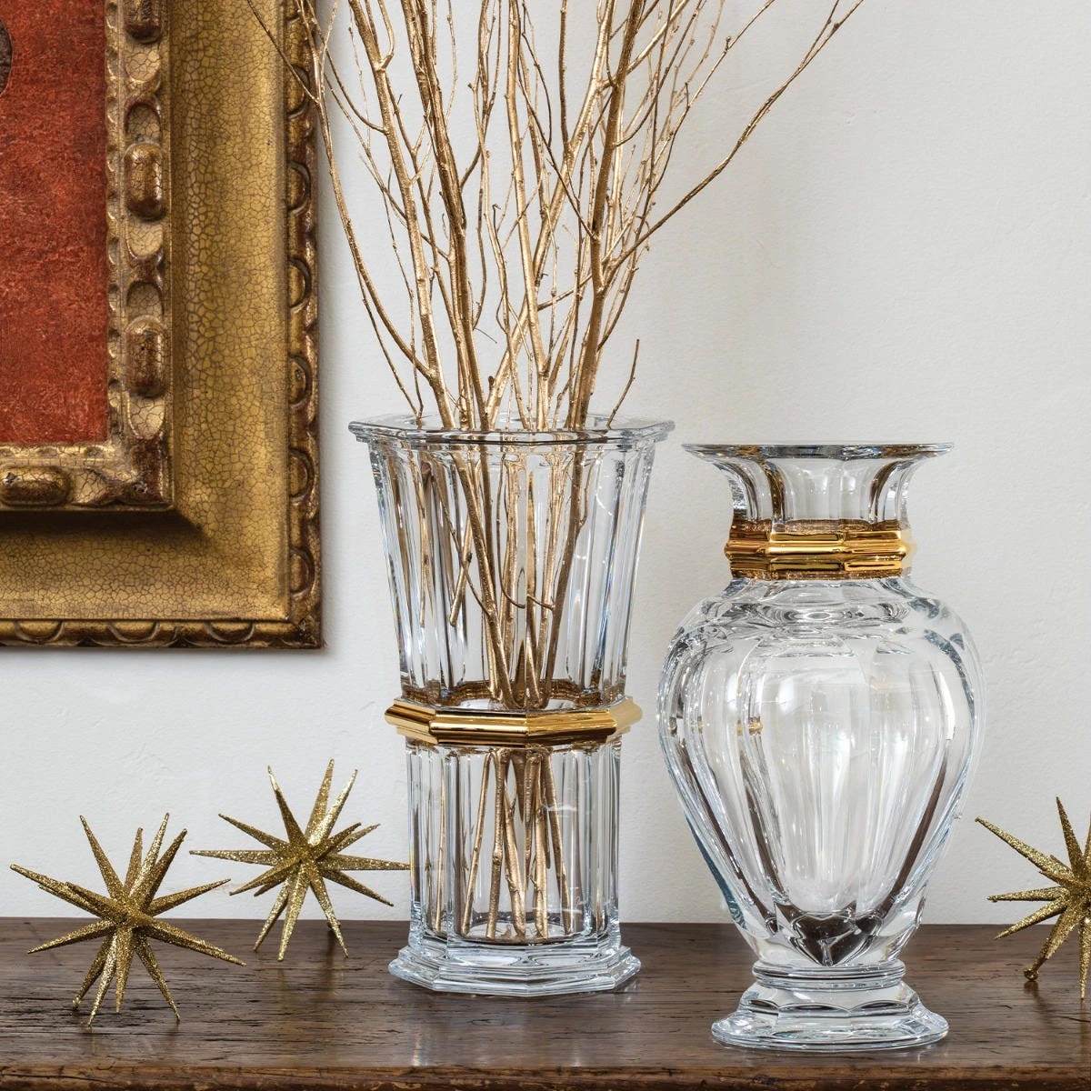 Baccaratâs iconic Harcourt design dates back to 1841, since the age of Napoleon III. Itâs been reinterpreted as a gorgeous gold and clear crystal vase designed by Thomas Bastide. The vaseâs octagonal shape is enhanced by cut facets and an architectural style, demonstrating the Harcourt designâs timeless aesthetic. It stands 12.6 inches tall, perfect for a beautiful bouquet of fresh-cut flowers. At the center of the vase, a ring of 20-karat gold provides a stunning accent. Use the Harcourt 1841 Vase in any room of the house as a home dĂ©cor object or as a centerpiece.