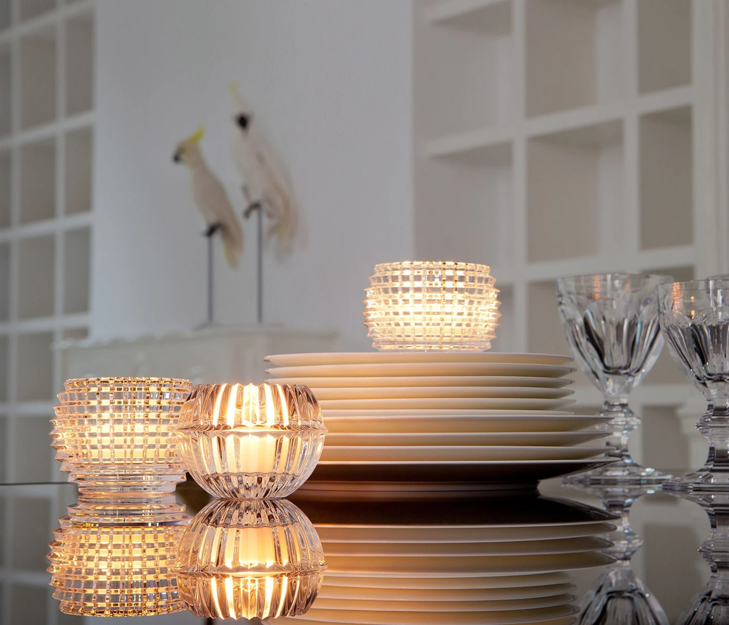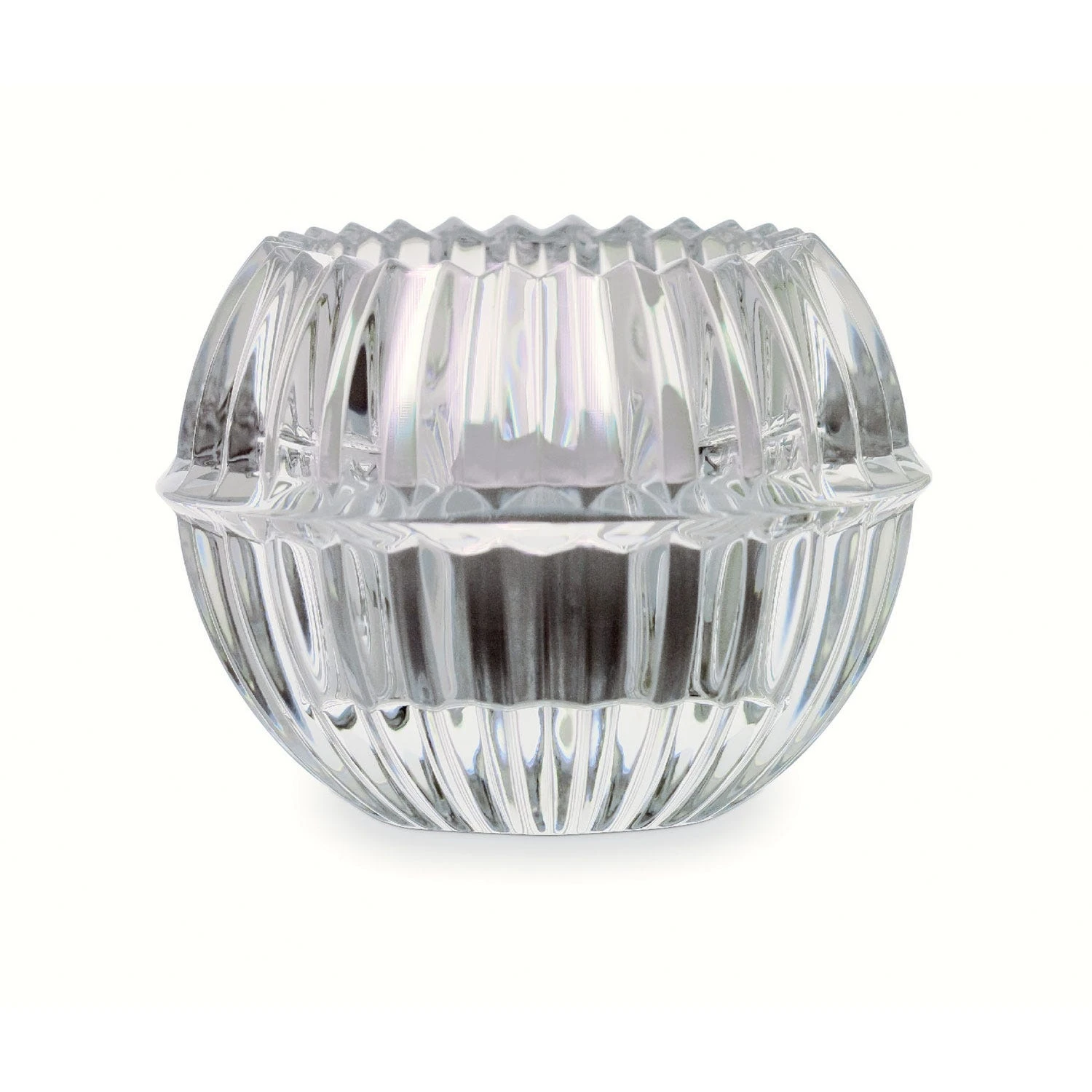 Baccarat’s artistry is evident in the Mille Nuits Round Votive. Featuring a beveled circumference, the clear crystal votive produces an incredible optical effect when used with a lit candle, sending out glittering light and reflections around it.